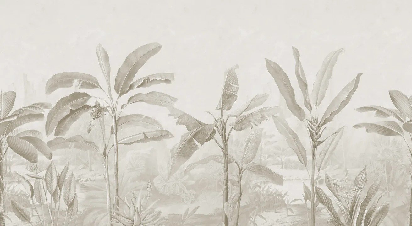 Trópico minimalista que presenta palmas gigantes estilizadas en tonos beige suaves sobre fondo neutro. Las formas arquitectónicas de las hojas crean un impacto visual elegante sin ser abrumador. Perfecto para interiores modernos que buscan incorporar elementos tropicales con sofisticación, aportando frescura y elegancia contemporánea al espacio.