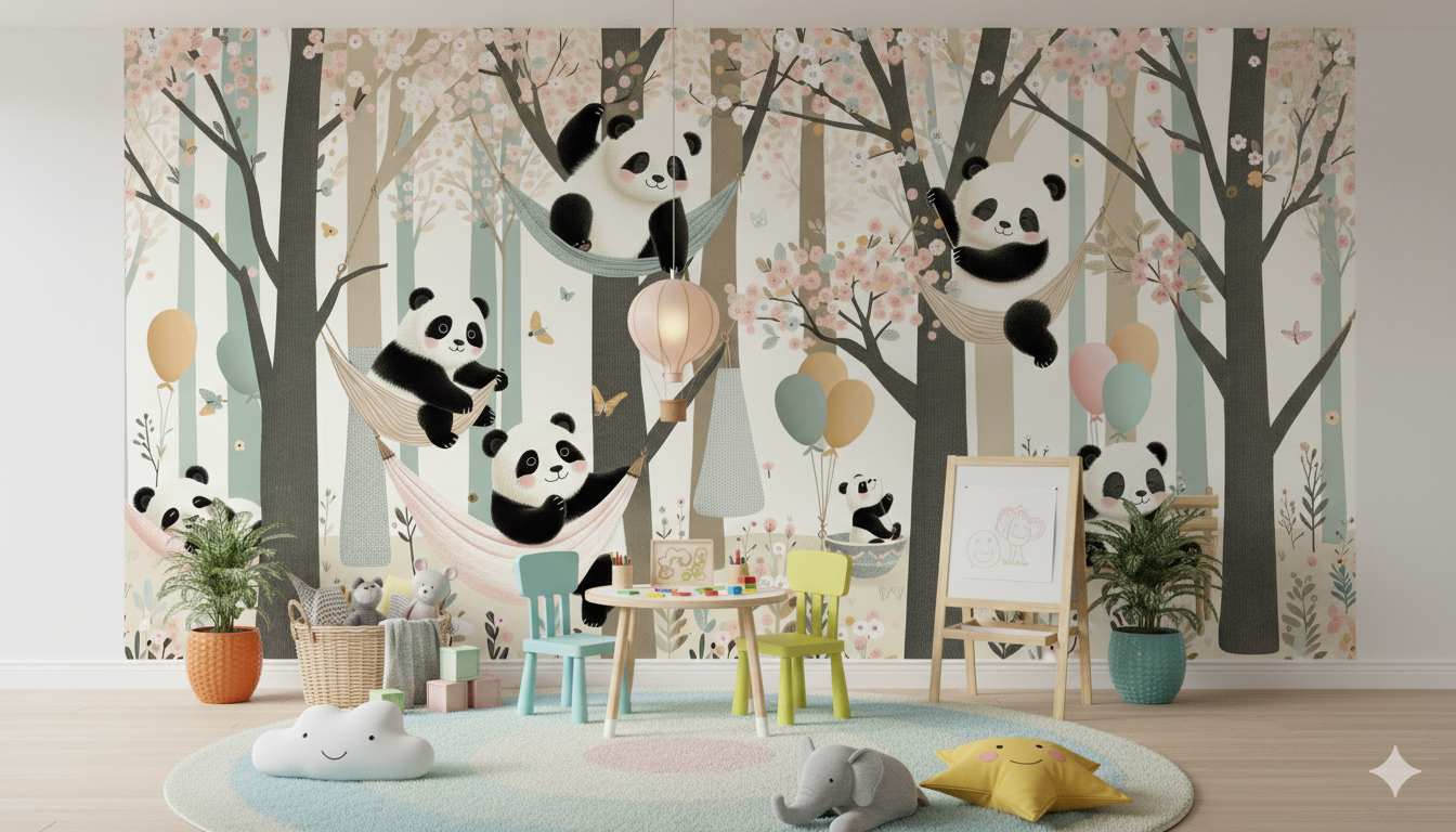 Este hermoso fotomural presenta adorables pandas bebé divirtiéndose en un mágico bosque de cerezos en flor. Los pequeños pandas se balancean en hamacas y juegan entre ramas decoradas con delicadas flores rosadas, creando una escena tierna y relajante que transmite paz y ternura al dormitorio infantil.