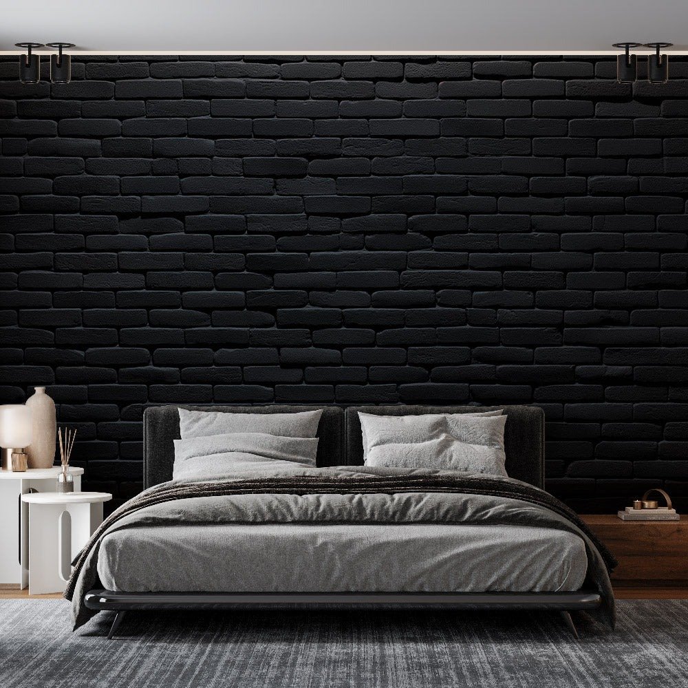 Diseño minimalista radical con mampostería en negro profundo absoluto que presenta textura superficial sutil y patrón horizontal regular hipnótico. El monocromatismo total y la ausencia de variación cromática crean atmósfera contemplativa y elegancia contemporánea máxima, ideal para dormitorios boutique, espacios zen oscuros o ambientes minimalistas que buscan impacto dramático con simplicidad sofisticada y presencia arquitectónica poderosa pero serena.