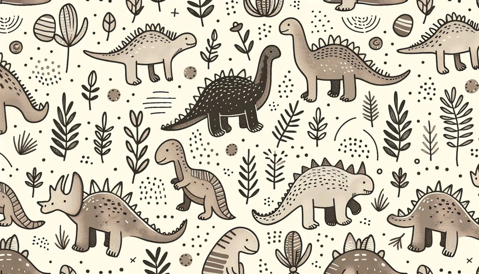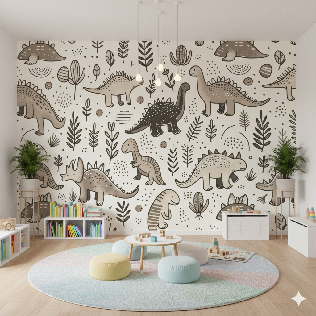 Este sofisticado fotomural combina la fascinación por los dinosaurios con un diseño elegante y atemporal que se adapta perfectamente a habitaciones infantiles con estilo. El patrón presenta una colección de dinosaurios ilustrados en un estilo vintage botanical, con tonos tierra que van desde el beige hasta el marrón oscuro, creando una paleta cromática cálida y acogedora. El diseño incluye diferentes especies de dinosaurios como Estegosaurios, Brontosaurios, Triceratops y Tiranosaurios, intercalados con elementos botánicos como hojas, ramas, flores y semillas que evocan el período prehistórico. La composición repetitiva y orgánica del patrón crea una sensación de movimiento y continuidad que envuelve toda la habitación en un ambiente natural y relajante. Es ideal para padres que buscan una decoración temática de dinosaurios pero con un enfoque más refinado y menos infantil.