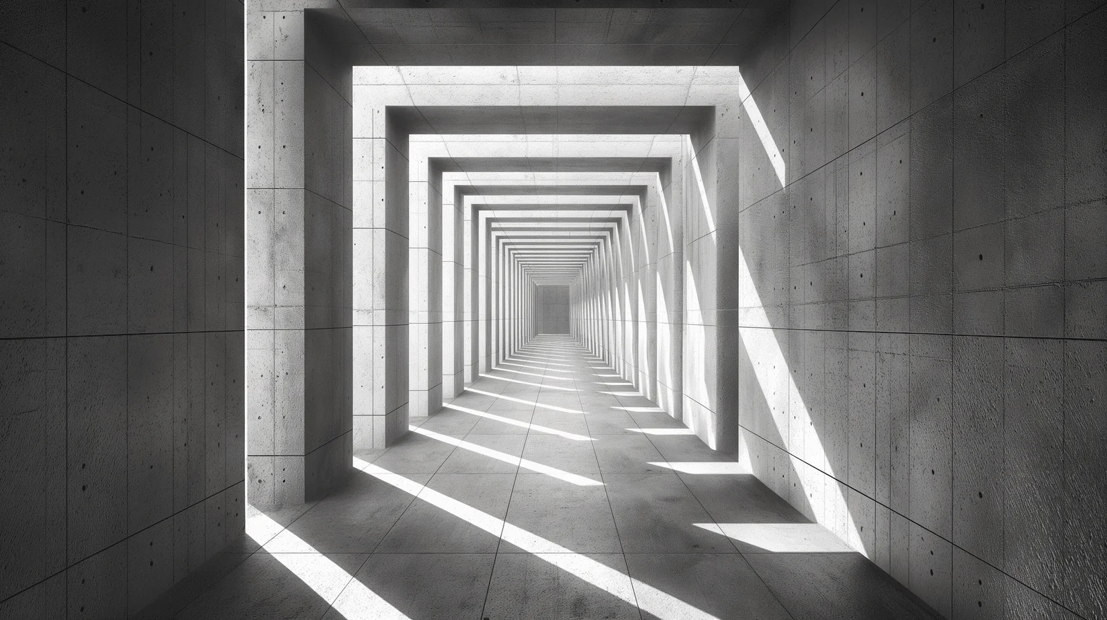 Fotomural minimalista arquitectónico que presenta túnel de marcos rectangulares concéntricos en hormigón visto con textura de encofrado visible. La iluminación lateral dramática y sombras angulares profundas crean ritmo visual hipnótico y sofisticación brutalista contemporánea, perfecta para espacios modernos, galerías o ambientes que buscan elegancia industrial con geometría pura y presencia arquitectónica monumental serena.