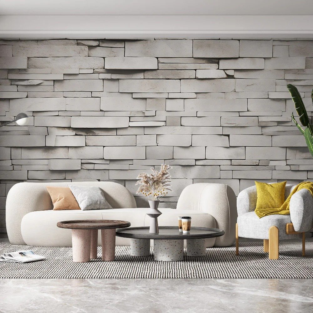 Diseño minimalista de bloques rectangulares en blanco puro con patrón apilado irregular que genera profundidad tridimensional sofisticada. Las sombras sutiles y el acabado luminoso crean atmósfera serena y elegancia escandinava, ideal para salones contemporáneos, espacios nórdicos o ambientes que valoran la pureza cromática con textura arquitectónica sutil y sofisticación luminosa refinada.