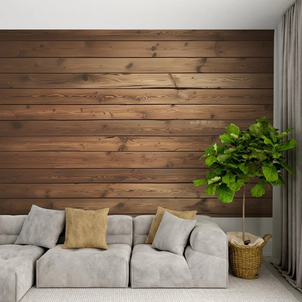Fotomural de pino con tablones horizontales en tonos miel y caramelo. Vetas suaves y nudos naturales crean textura orgánica. Perfecto para dormitorios acogedores, estudios o salas que buscan calidez natural con atmósfera relajante y confortable contemporánea.