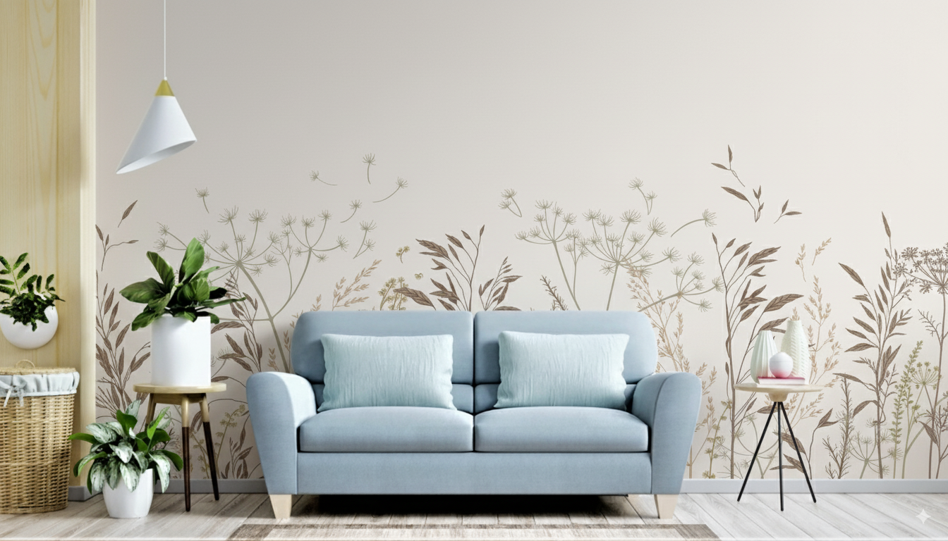 Este elegante fotomural captura la belleza sutil de un prado silvestre con detalladas ilustraciones de hierbas, gramíneas y dientes de león flotantes. Los tonos tierra y beige crean una atmósfera serena y natural, perfecta para espacios que buscan conectar con la tranquilidad del campo y aportar un toque orgánico sofisticado.