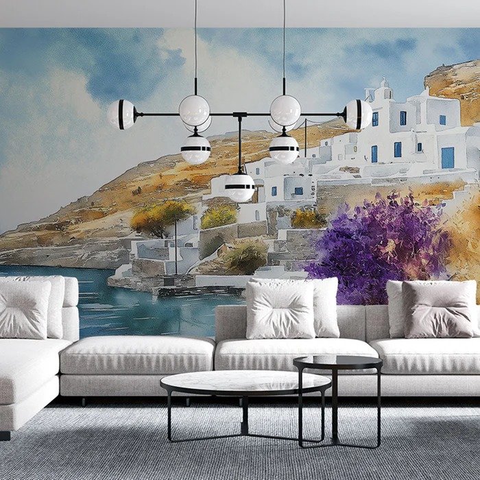 Fotomural artístico en acuarela que muestra el pueblo escalonado de Santorini abrazando el acantilado volcánico, con las casas blancas descendiendo hacia el mar, flores moradas de buganvilla, tonos beige de las rocas y pinceladas translúcidas que aportan ligereza y luminosidad mediterránea.