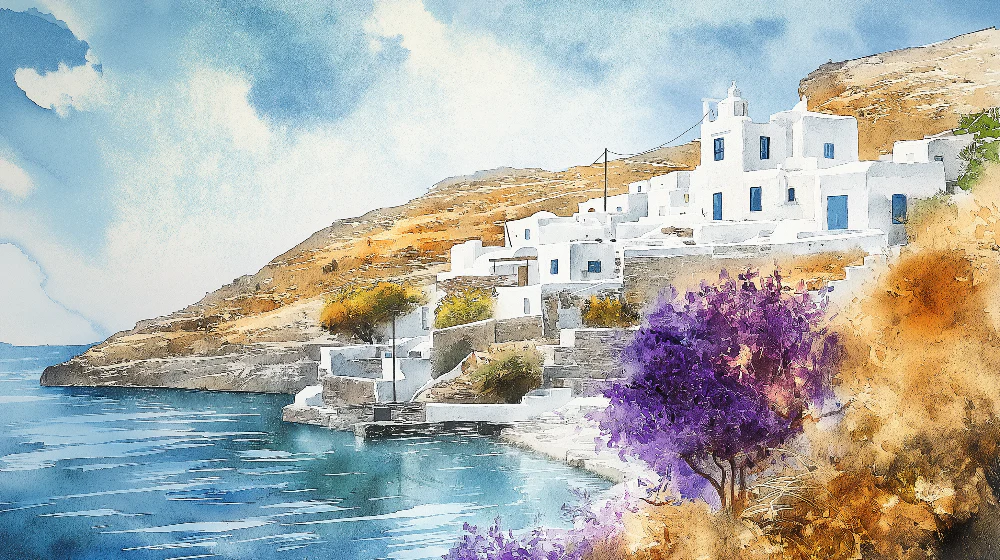Casas blancas sobre acantilado en delicada técnica de acuarela