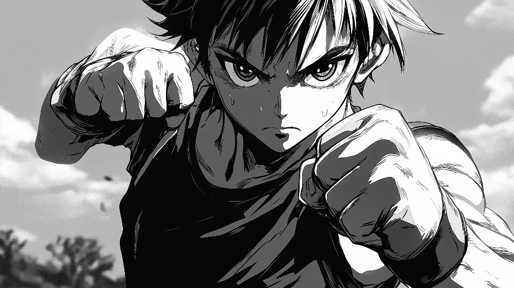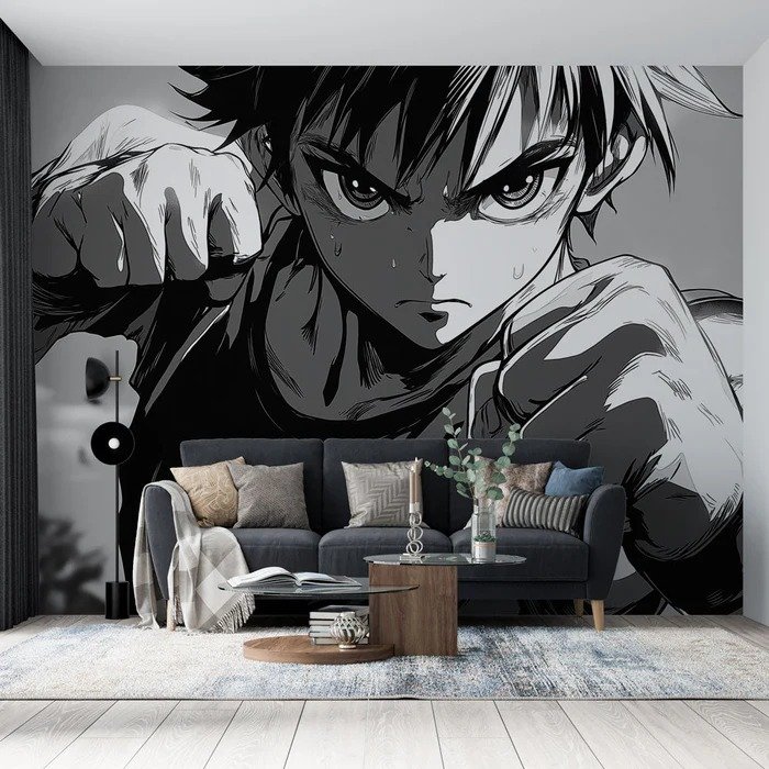 Composición dinámica en blanco y negro con perspectiva directa de un puñetazo poderoso. Perfecto para jóvenes deportistas o amantes de las artes marciales en su decoración.