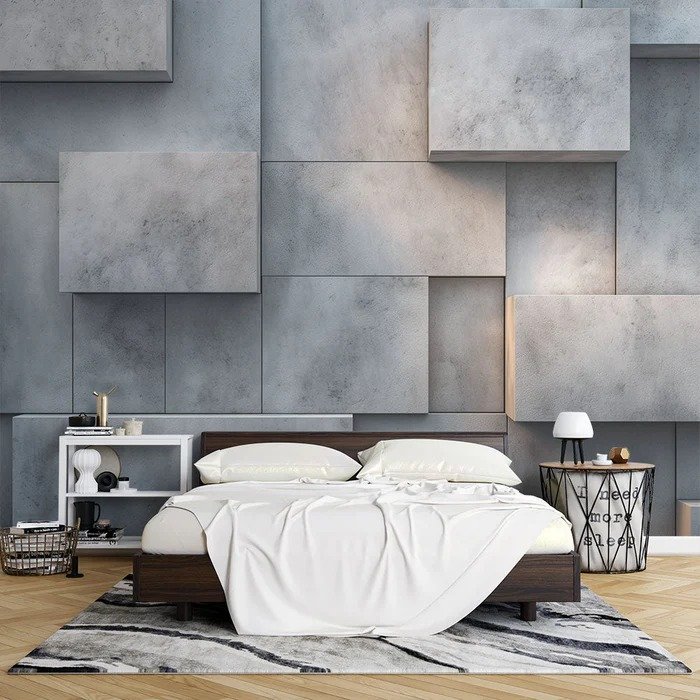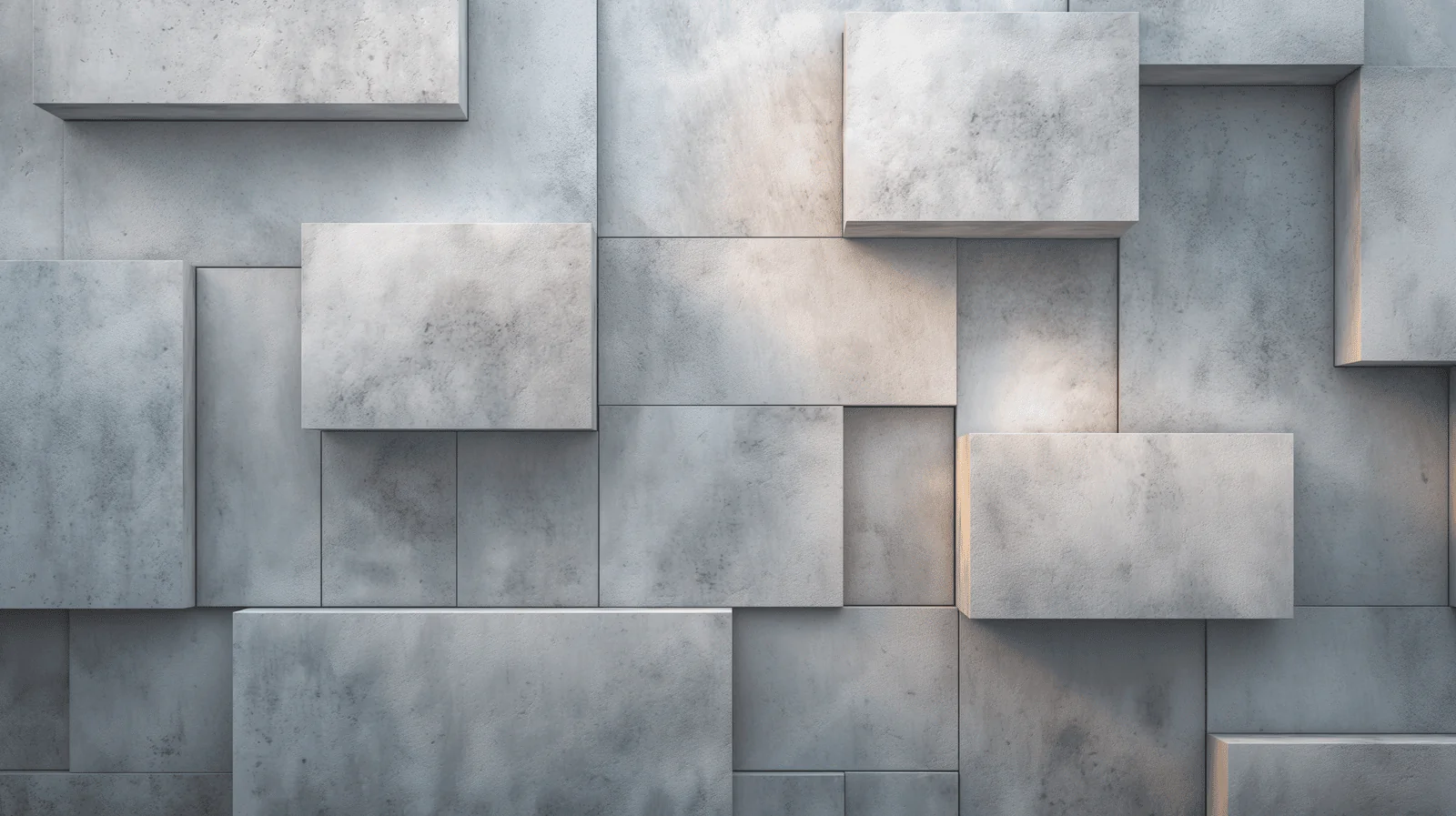 Composición minimalista refinada con paneles rectangulares superpuestos en hormigón claro con manchas orgánicas sutiles y variaciones tonales. Los relieves tridimensionales delicados y sombras suaves crean elegancia arquitectónica serena y sofisticación contemporánea tranquila, ideal para dormitorios zen, espacios minimalistas o ambientes que buscan pureza formal con calidez material y presencia escultórica contemplativa sutil.