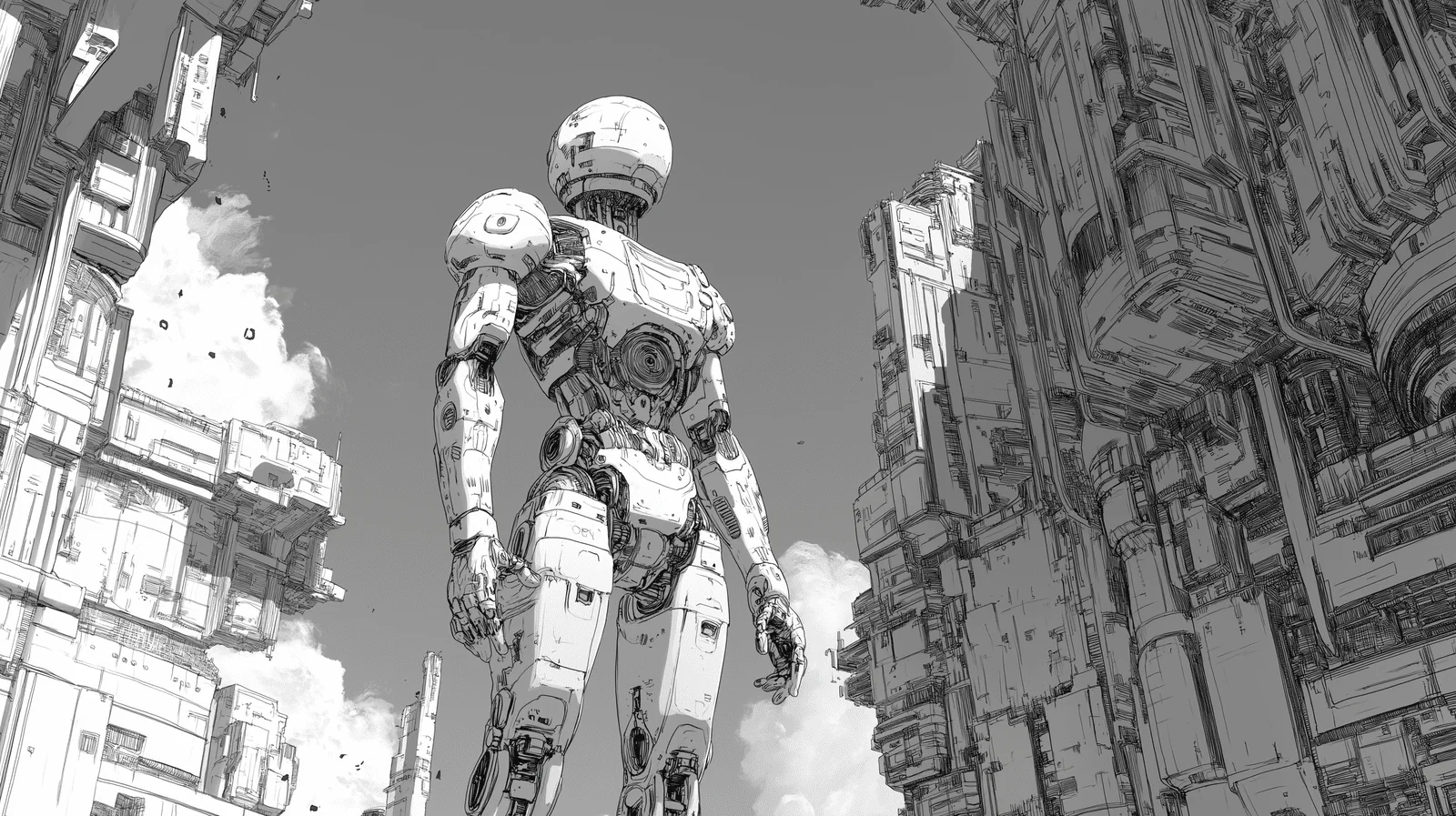 Diseño de ciencia ficción con robot detallado en entorno urbano futurista. Perfecto para fanáticos de la tecnología y los mechas en espacios juveniles modernos.