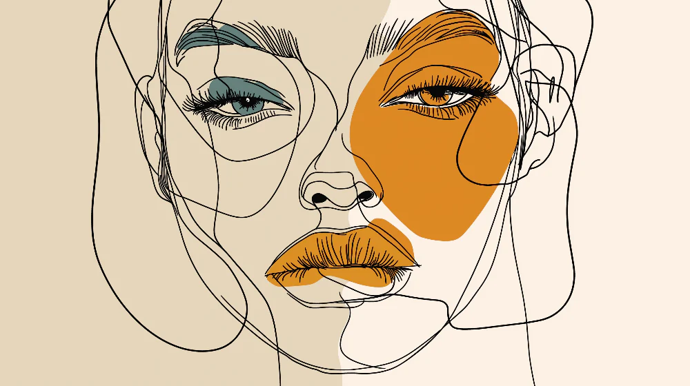 Diseño de arte lineal contemporáneo que presenta un rostro femenino donde las líneas negras continuas se combinan con manchas naranjas sólidas. Los ojos con pestañas marcadas y labios naranjas crean un contraste vibrante sobre fondo neutro, fusionando minimalismo con color expresivo.