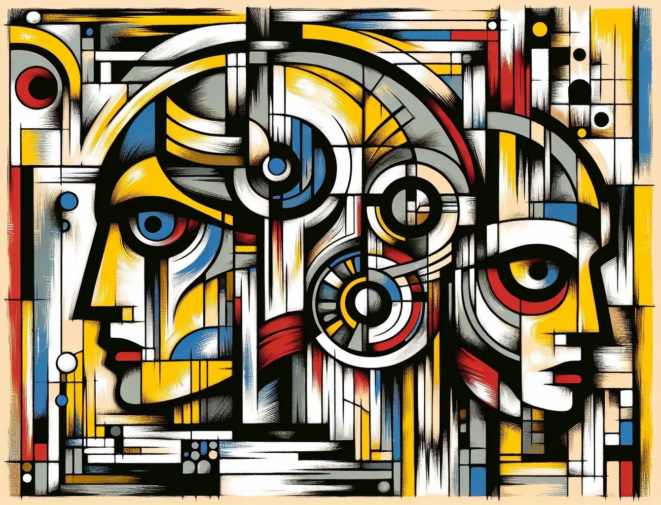 Mural complejo con múltiples ojos y elementos faciales fragmentados en estilo geométrico. Paleta de amarillos, rojos, azules y negros. Perfecto para espacios modernos sofisticados que buscan arte conceptual con impacto visual intelectual y contemporáneo.