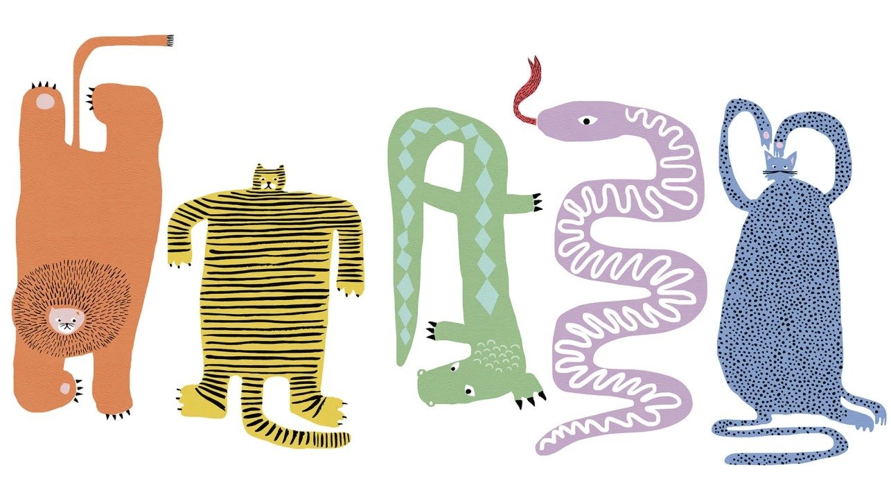Este vibrante fotomural presenta una interpretación contemporánea del safari con animales estilizados en formas geométricas: un león con melena radiante en naranja, un tigre a rayas amarillas, un cocodrilo en tonos verdes, una serpiente lila y un mono con puntos azules, todos sobre fondo blanco limpio.