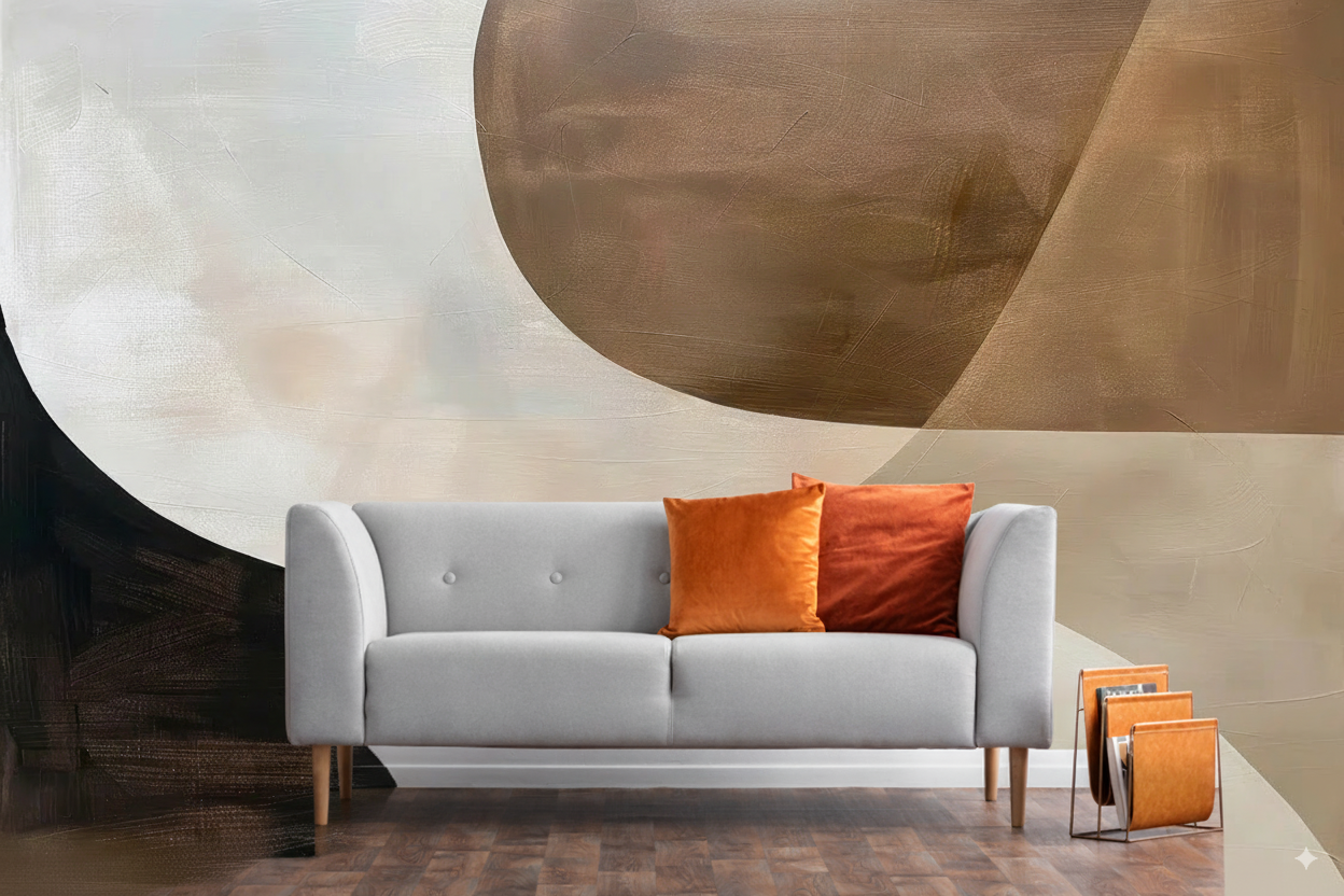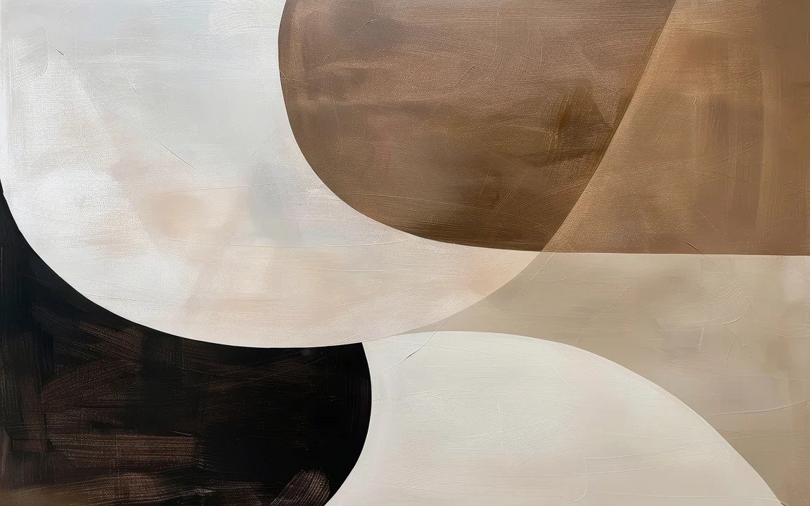 Este sofisticado fotomural presenta una composición abstracta de gran elegancia, donde círculos y formas orgánicas se entrelazan creando un ritmo visual cautivador. La paleta de colores cálidos incluye tonos tierra, ocres, beiges cremosos y profundos negros que se complementan armoniosamente. Las texturas brushstroke aportan una dimensión artística única, simulando pinceladas reales que añaden carácter y profundidad a cada forma. El juego de superposiciones y transparencias genera un efecto visual dinámico pero sereno, perfecto para espacios que busquen un ambiente acogedor y contemporáneo. Esta obra es ideal para salones principales, dormitorios matrimoniales o espacios de trabajo que requieran una presencia artística distinguida sin sacrificar la tranquilidad del ambiente.