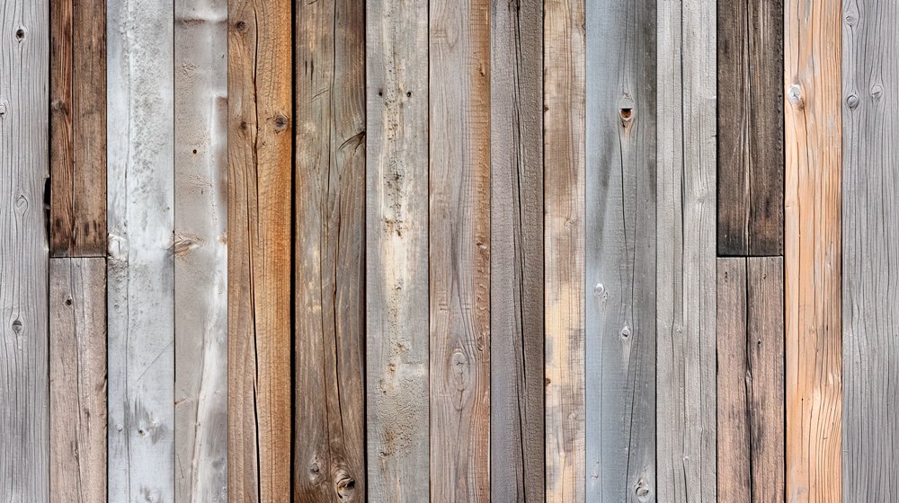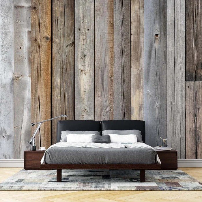 Mural con tablones verticales de diferentes anchos y tonos desde grises hasta caramelos. Acabado vintage auténtico con marcas de tiempo. Ideal para dormitorios eclécticos, lofts creativos o espacios que celebran la diversidad natural de materiales recuperados únicos.