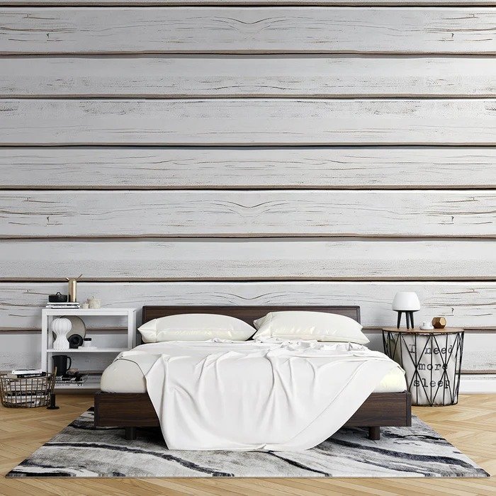 Diseño de tablones blancos con acabado desgastado que evoca estilo costero y shabby chic. Textura auténtica con grietas y marcas de tiempo. Ideal para dormitorios románticos, espacios nórdicos o ambientes que buscan luminosidad con carácter rústico refinado.