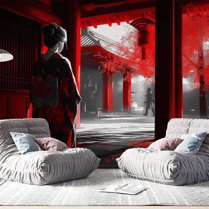 Diseño atmosférico con geisha en contra luz frente a templo tradicional en paleta roja dramática. Perfecto para admiradores de la estética japonesa que buscan misterio y elegancia cultural en su decoración.