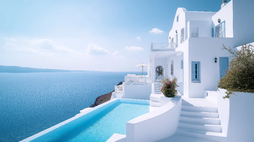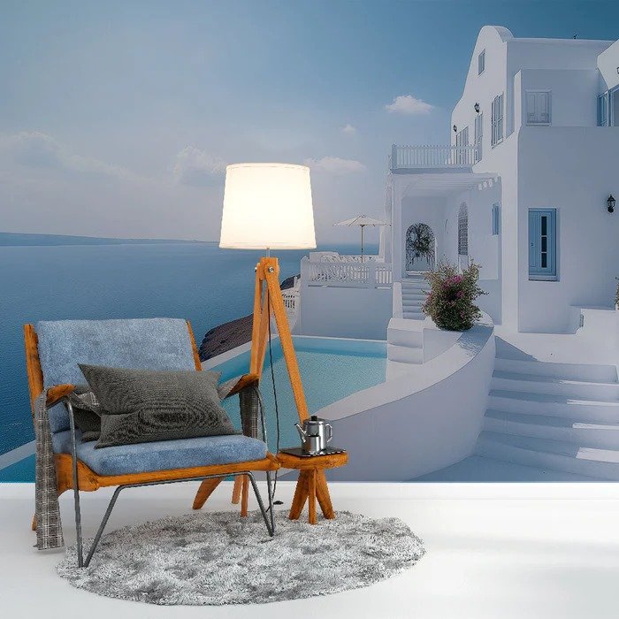 Fotomural fotográfico realista que captura una lujosa terraza santoriniense con piscina infinita, arquitectura cicládica blanca inmaculada, barandillas características, flores en macetas, muebles de exterior y la impresionante vista de la caldera azul al atardecer, transmitiendo elegancia y exclusividad mediterránea.