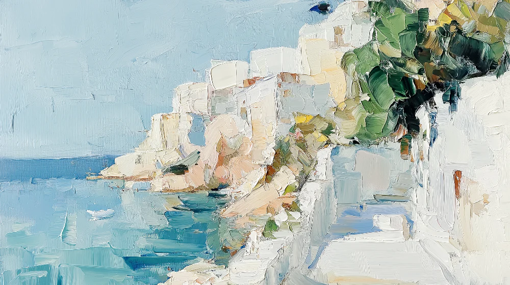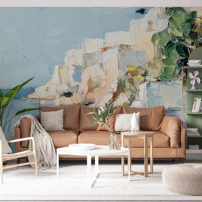 Fotomural con técnica de óleo aplicado con espátula que crea texturas tridimensionales pronunciadas, representando las casas blancas de Santorini con pinceladas gruesas y expresivas en blanco, beige y toques de verde, logrando un efecto táctil y artístico sobre fondo de cielo y mar en azul claro.