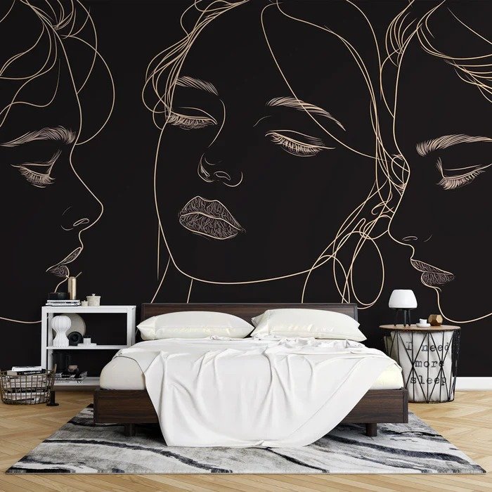Fotomural sofisticado con fondo negro que presenta tres rostros femeninos con ojos cerrados en distintas posiciones. Las líneas doradas y blancas definen rasgos serenos y labios detallados, creando una atmósfera meditativa y elegante con múltiples puntos focales.