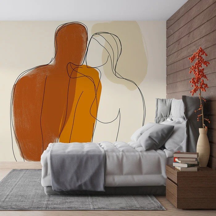 Diseño que presenta tres siluetas de espaldas en diferentes tonos: terracota sólido, mostaza y líneas negras sobre fondo neutro. La composición minimalista celebra la forma humana mediante bloques de color y trazos lineales creando una obra contemporánea que transmite unidad y diversidad visual.