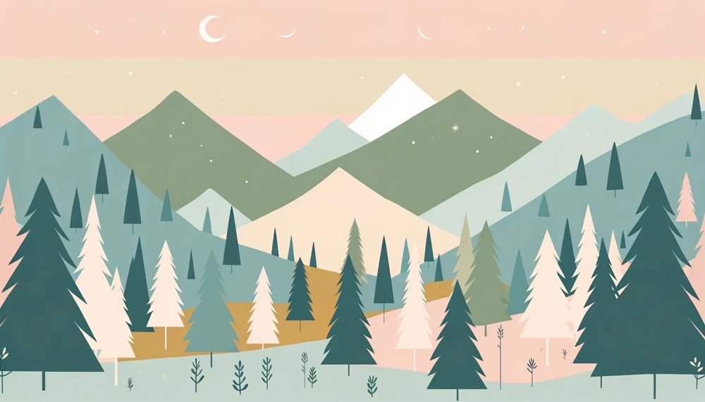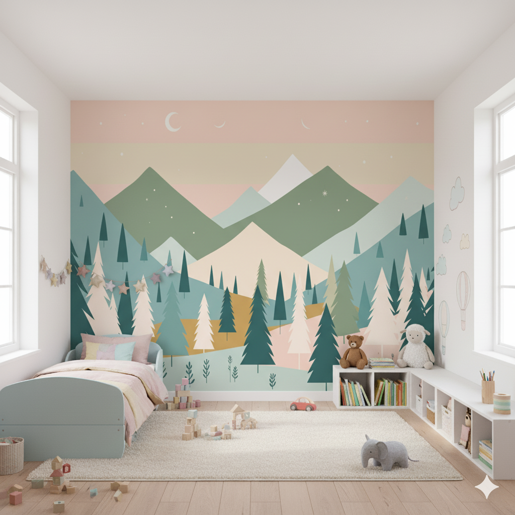 Este encantador fotomural nocturno combina elementos naturales con un tratamiento geométrico contemporáneo que evoca cuentos de hadas modernos. La composición presenta un valle montañoso estilizado donde predominan las formas angulares y superpuestas en una paleta cromática sofisticada de rosa empolvado, verde sage, azul grisáceo y crema. Una luna creciente blanca preside el cielo estrellado, acompañada de estrellas dispersas que añaden magia nocturna. Las montañas se representan como formas geométricas planas que se superponen creando profundidad visual, mientras que un bosque de coníferas estilizadas de diferentes alturas y tonos puebla el valle. La vegetación incluye árboles de formas variadas – algunos triangulares, otros más orgánicos – que crean un ritmo visual interesante. Pequeños arbustos y elementos botánicos minimalistas completan la escena del suelo del valle. Este fotomural es ideal para habitaciones donde se busca una estética moderna pero acogedora, perfecta para niños que aprecian diseños más sofisticados y que encuentran tranquilidad en paisajes nocturnos suaves y contemplativos.